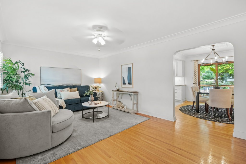 Step inside to find a foyer leading to a cozy living room adorned with hardwood flooring, cove ceilings, and an expansive front window featuring California shutters. The rounded doorways add a touch of elegance, guiding you to a formal dining room complete with an updated lighting fixture and sliding doors that open to the beautiful rear yard.