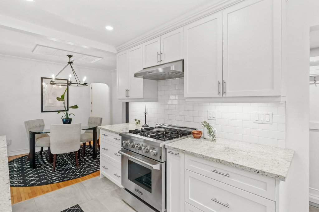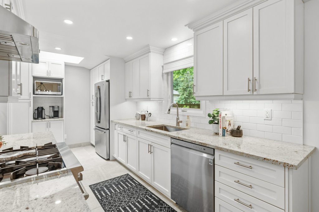 The tastefully updated galley-style kitchen is a culinary delight, boasting white cabinetry, granite countertops, stainless steel appliances, a subway tile backsplash, undermount lighting, pot lighting, a coffee station nook, convenient pantry, and a skylight that bathes the space in natural light. A convenient mudroom with a door to the carport adds to the home’s functionality.
