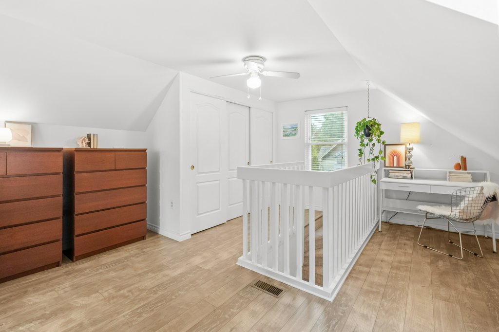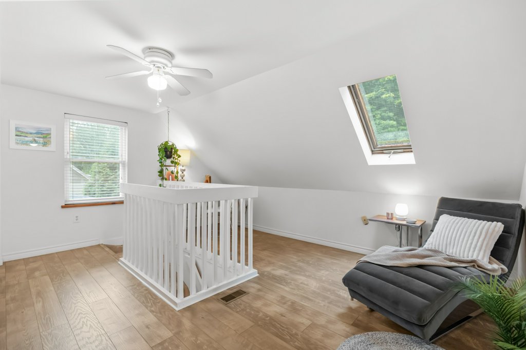 The main level also includes two spacious bedrooms and an updated 4-piece bathroom. Ascend to the upper level to discover a versatile loft space with a skylight and storage, leading to a large primary retreat. This serene space features a walk-in closet and a 2-piece ensuite bathroom.