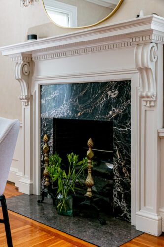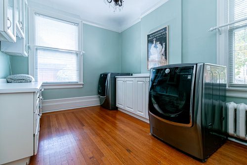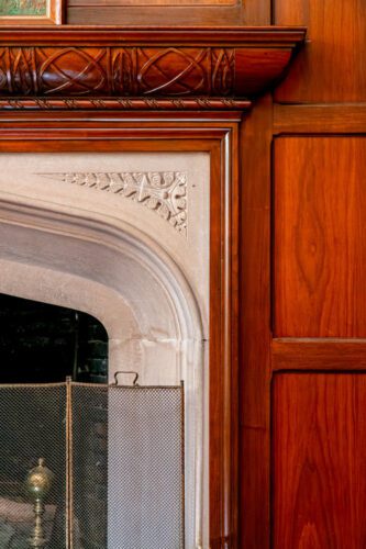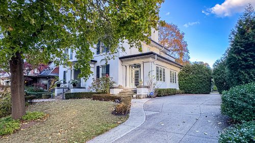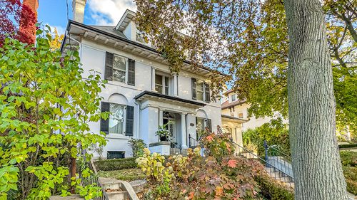 A rare offering on one of Hamilton’s most distinguished streets in the heart of the coveted Durand neighbourhood. This stately circa 1910 Colonial Revival residence epitomizes timeless architecture, refined craftsmanship and grand-scale living tempered with family-friendly warmth. Set on a mature lot, this 6-bedroom, 4-bathroom home spans over 5522 square feet (above grade) of elegant living space, balancing meticulously preserved character with modern updates. Sweeping, wide concrete steps with decorative wrought-iron banisters and posts lead to the columned portico, where paired Ionic columns, dentil moulding, and oversized planters create an unforgettable sense of arrival. The front entry – framed by intricate sidelights and a fanlight transom – floods the huge centre hall with natural light, highlighting its barrelled 10-foot ceiling and the original hardwood flooring throughout. Framed by lockable pocket doors, the formal living room features a stately ornamental fireplace with a classically detailed mantel, oversized chandelier with plaster medallion, and French doors leading into a breathtaking sunroom/homework space with bespoke bench seating and cabinetry. Heated, Regency-influenced soft blue, cream and black painted flooring sets the stage for the home’s harmonious and welcoming colour palette. A second pair of pocket doors open to a bright and spacious dining room with yet another ornamental fireplace framed with light sconces, a marble surround, dentil moulding, and stunning corbels. Georgian-style shell-crested cabinets flank one of the room’s two soaring windows and bypass the need for furniture clutter. A rarely found swinging door opens to the kitchen hallway, making entertaining a breeze. The bright kitchen blends timeless design with modern function: abundant cabinetry, granite countertops, a large centre island with seating for five and a beverage fridge, a granite-topped built-in desk with under-cabinet lighting, heated marble flooring, a gas range, stainless-steel appliances and a convenient second staircase. The space opens to a sunken great room bathed in sunlight from multiple windows and a discreet skylight. With newer hardwood floors, pot and wall lighting, crown moulding and garden access beneath an arched transom with moon views, this room is perfect for family gatherings and indoor-outdoor living. Completing this highly functional space are a powder room (also with heated marble flooring) and a window-topped door opening onto a scenic deck, ideal for barbecues and entertaining. Completing the main level is a quietly elegant, panelled study, entered through a rare double-faced door designed to blend seamlessly with the wall panels. It features splendid rosette and vine plaster moulding, an intricately carved fireplace with a stone Gothic arch (once wood-burning and currently unused), and beautifully crafted built-in cabinetry. A tall, handsomely framed window draws in dappled light from the corner garden, overflowing with David Austin roses. Whether working from home or relaxing off-hours, this wonderfully private space offers an oasis of calm among the grander-scaled rooms. The wide, curved main staircase opposite is a showstopper, with a sculpted urn newel post, distinctive fluted and barley-twist balusters, and a chic black-and-ivory palette.