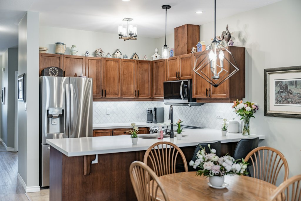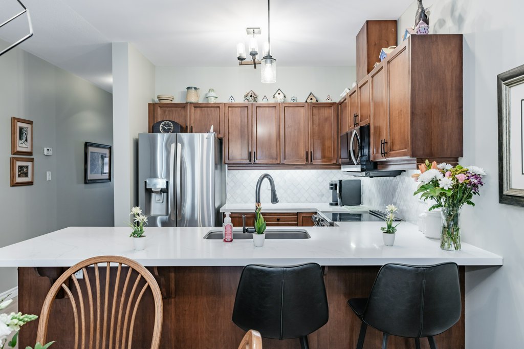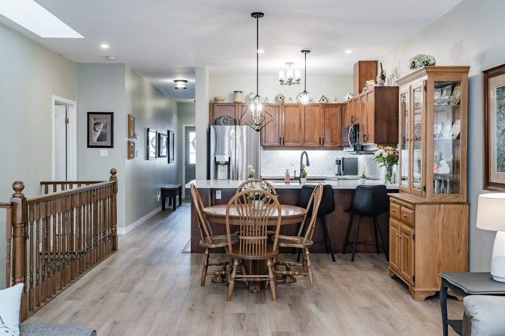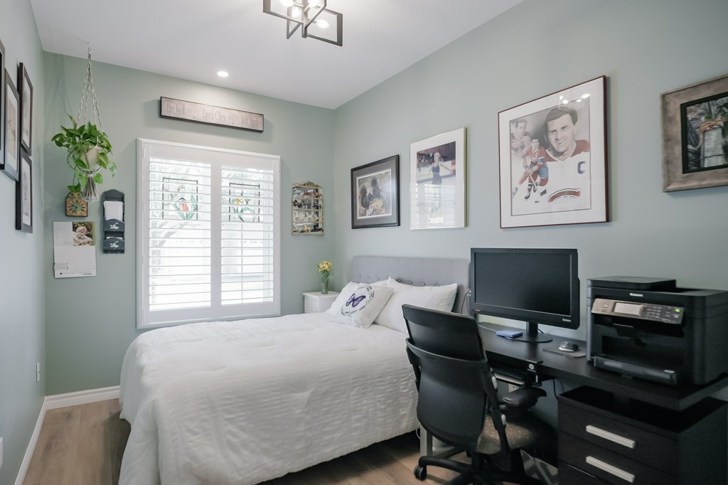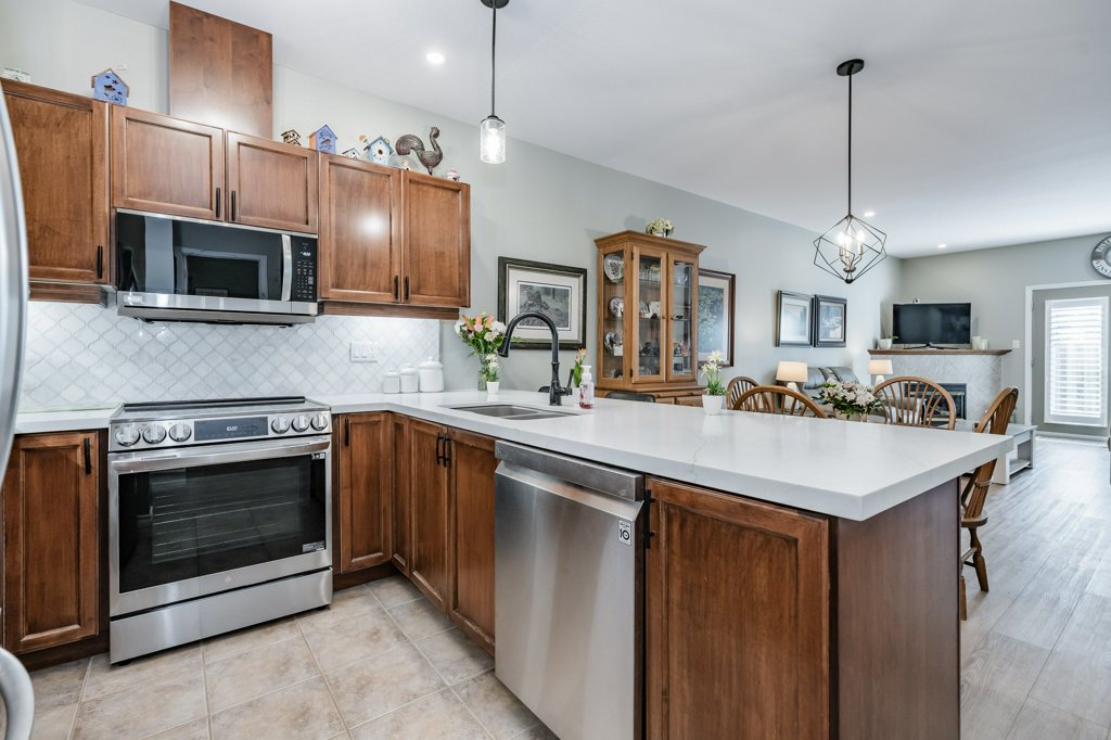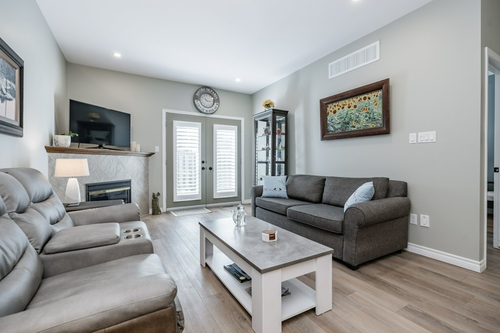 Quality Starward-built bungalow townhome on Hamilton’s West Mountain! This tastefully updated 1141-square-foot unit features 2 bedrooms, 2 bathrooms, and an open-concept design – perfect for modern living. Step inside to luxury vinyl plank flooring throughout and be greeted by a refreshed kitchen featuring stainless steel appliances (with a water line to the fridge), quartz countertops, modern tiled backsplash, undermount lighting, and convenient breakfast bar seating for 4+. Natural light floods the space thanks to a skylight, illuminating the open-concept formal dining and living room areas. The formal living room features a corner gas fireplace and French doors leading to the rear yard. Pot lighting and upgraded fixtures add elegance, while California shutters provide privacy. The spacious primary retreat offers double closets and an updated 3-piece ensuite bathroom with an oversized glass shower and linen closet. A second spacious bedroom and 3-piece bathroom with a corner shower are also on the main level, along with main-level laundry facilities. The single-car garage with inside entry adds convenience. The unfinished basement awaits your finishing touches, with some framing and drywall completed. Outside, enjoy the fenced rear yard with an oversized deck, gas line to rear barbecue, and grass area. Other noteworthy improvements include fresh neutral-paint tones (2023), a central vacuum system (2023), furnace (2024), water heater (2024) & more. With a low monthly condominium fee of $360.01 covering building insurance, exterior maintenance, parking, and access to common elements, this home offers great value in a well-maintained condominium complex. Conveniently located with easy access to major transportation routes, shopping, schools, parks, public transit, and all other major amenities. A full list of recent improvements is available by request.