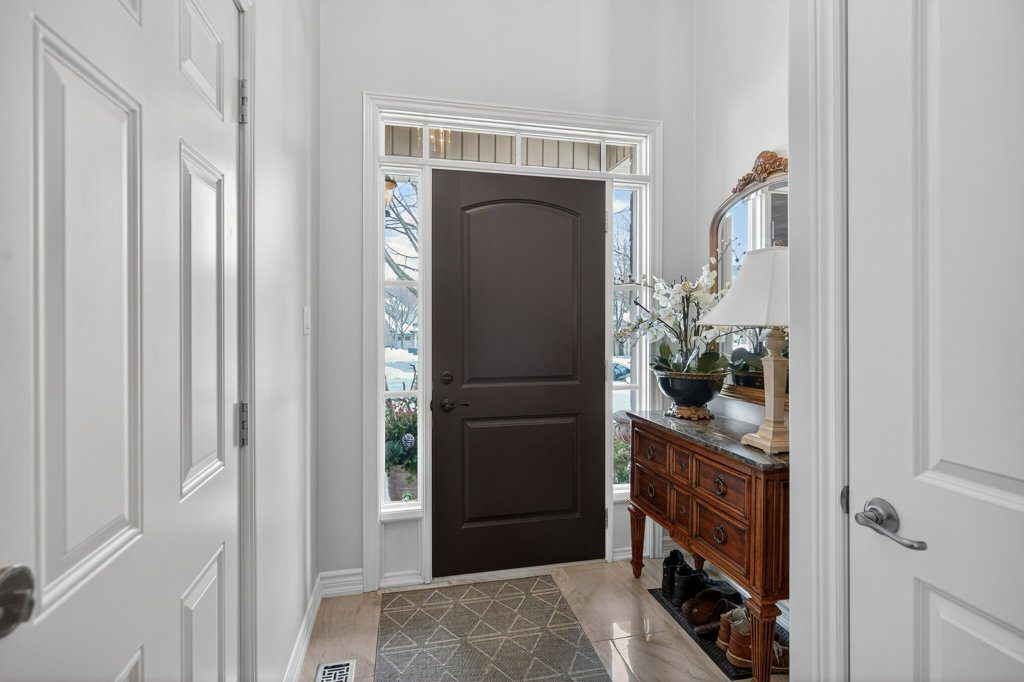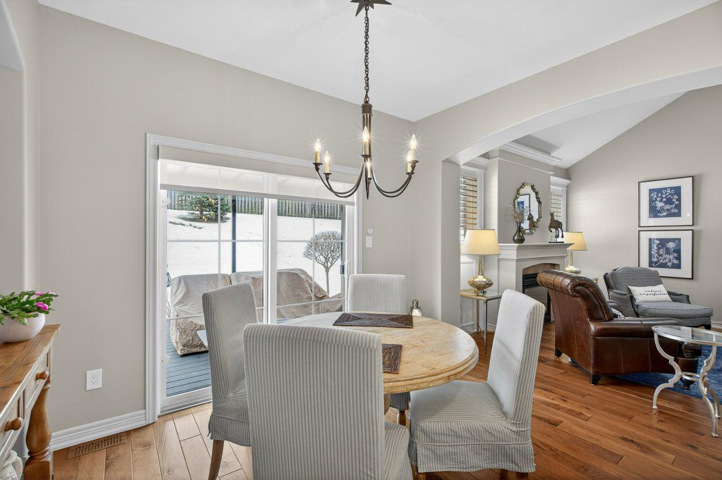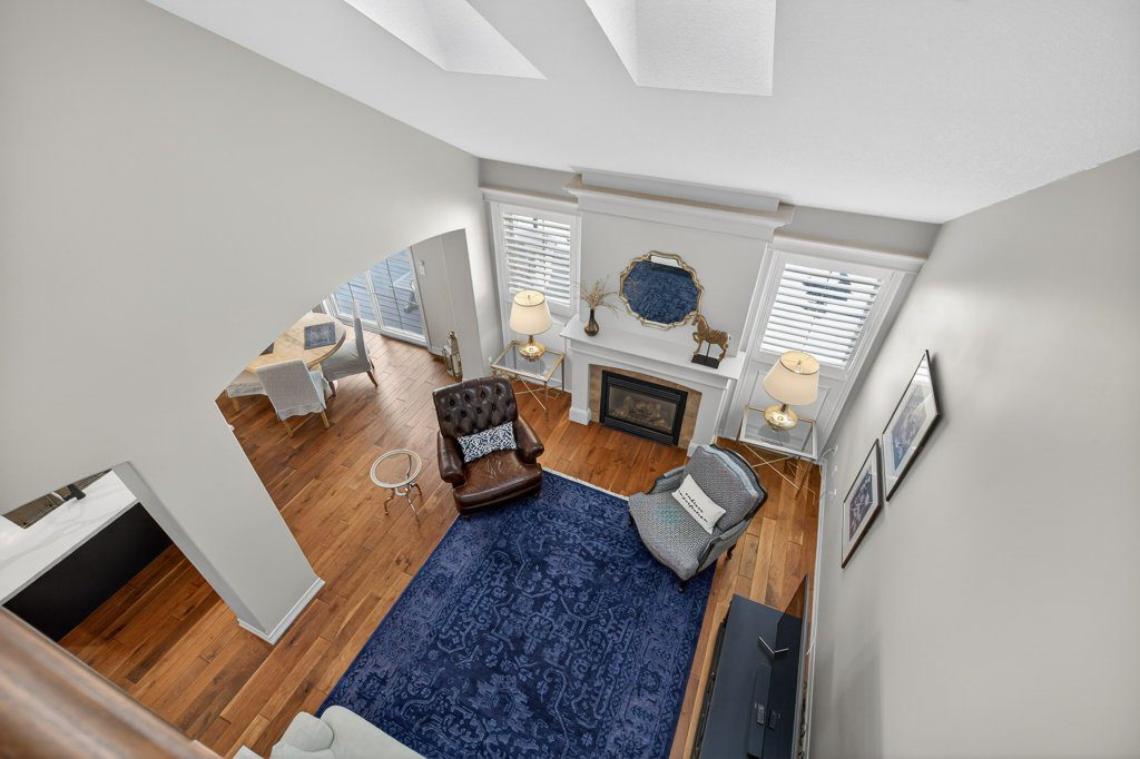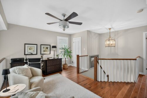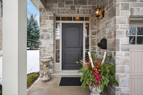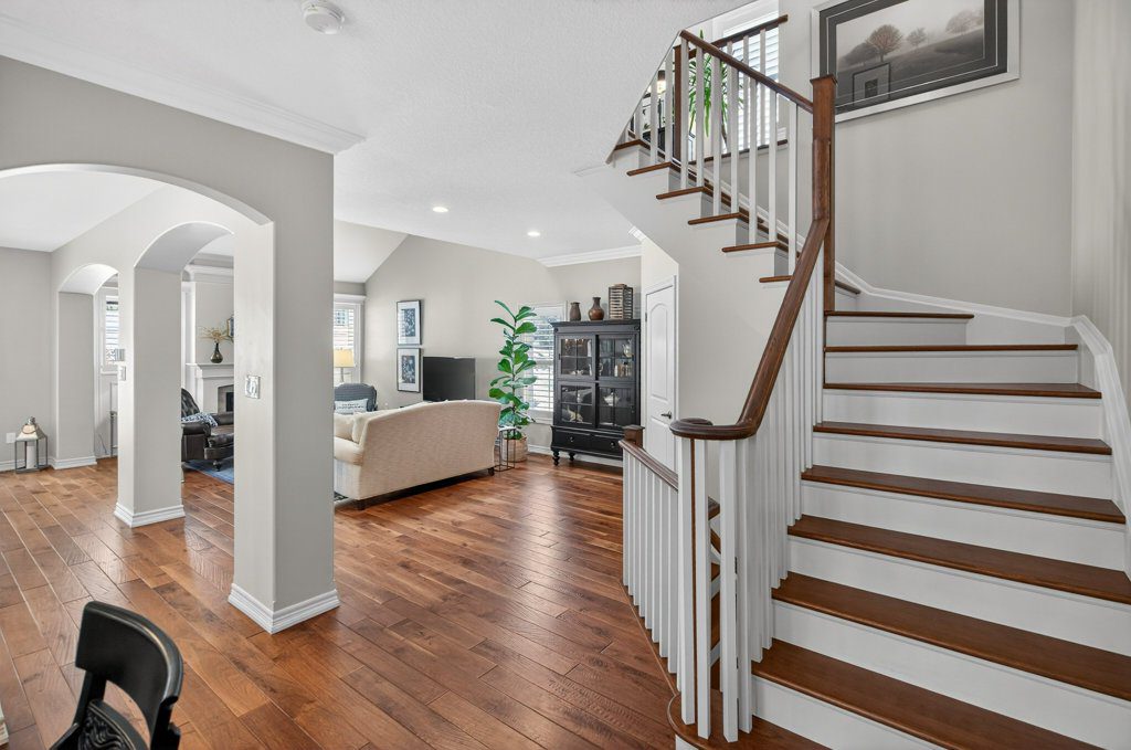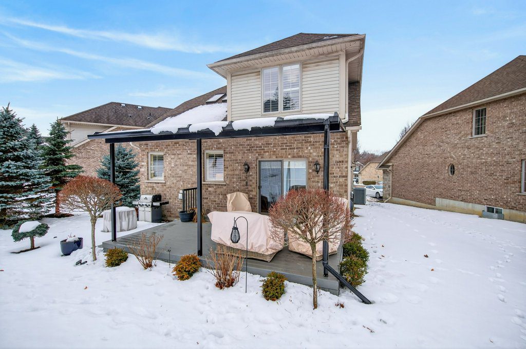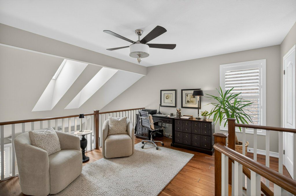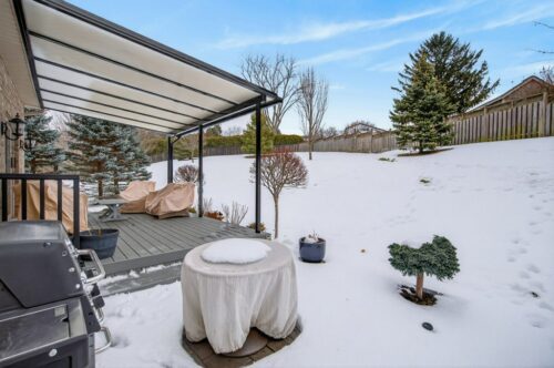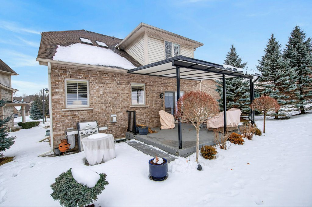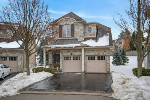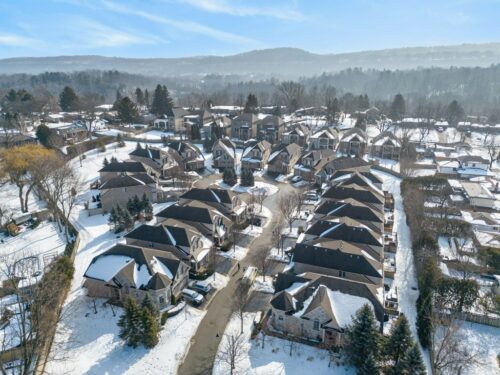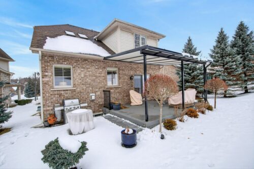 Set within one of Dundas’ most exclusive enclaves in Pleasant Valley, this exceptional executive residence by award-winning Schuit Homes offers an uncompromising blend of craftsmanship, privacy, and refined living. Positioned at the rear of the complex – highly desirable for its added privacy – this home makes an immediate impression with its striking façade blending stone & brick, complemented by a distinctive bell-shaped roof, pot lighting, and tasteful shutters. A covered front porch invites you to relax, while the double-car garage with inside entry, additional surfaced parking for two, and bonus visitor parking ensure convenience for both homeowners and guests. Step through the front door, beautifully framed by sidelights and a transom window, into an impressive foyer with soaring ceilings and a convenient storage closet. Just a few steps up, the main level unfolds into a refined open-concept living space enhanced by rich hardwood flooring and crown moulding throughout. At the heart of the home, the elegant kitchen showcases white cabinetry with crown detail, quartz countertops and backsplash, stainless steel appliances, and a centre island with breakfast bar seating for three or more. It flows effortlessly into the bright dinette area, where sliding doors overlook the rear yard, creating an ideal setting for everyday living. The adjoining living room is both inviting and dramatic, highlighted by vaulted ceilings, two skylights that flood the space with natural light, and a cozy gas fireplace. A separate formal dining room provides the perfect backdrop for hosting family dinners and special occasions. Completing the level are main floor laundry facilities and a well-appointed powder room, offering both comfort and convenience. Ascending the beautiful piano-style wood staircase to the 2nd level, the loft – currently used as a home office – overlooks the living room below. The primary retreat features exquisite wall moulding, two storage closets, and a spa-inspired 4-piece ensuite with an oversized glass shower, separate soaker tub, and quartz vanity. The second bedroom enjoys its own private 3-piece ensuite with an oversized glass shower. The fully finished basement offers a spacious recreation room with a corner gas fireplace, a bonus flex space, a 2-piece bathroom, and multiple storage and utility areas. The rear yard is designed for exceptional outdoor living, featuring an oversized composite deck with a patio cover for protection from the elements, a separate terrace area for additional seating or dining, and picturesque scenic views in every direction. Living in Pleasant Valley means enjoying Dundas’ natural beauty, scenic conservation areas, & walking trails, all while being minutes to the charming downtown core filled with boutique shops, cafés, restaurants, and community events. Quiet streets, mature surroundings, and easy access to major routes create the perfect balance of tranquillity and convenience. Opportunities in this sought-after enclave are rare – an exceptional home in an extraordinary setting.